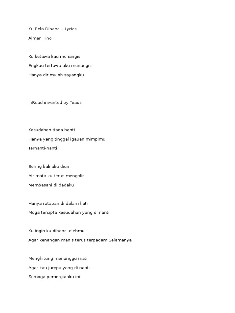 Aiman Tino Lyrics Ku Rela Dibenci Ku ketawa kau menangis Engkau tertawa aku menangis Hanya dirimu oh sayangku Kesudahan tiada henti Hanya yang tinggal igauan mimpimu ternanti-nanti Sering kali aku diuji Air mataku terus mengalir membasahi didadaku Hanya ratapan didalam hati Moga tercipta kesudahan yang dinanti Ku inginku dibenci oleh mu. Kau sayat hatiku dengan cintamu. Kamu bisa berlangganan atau membeli lagu ini lewat media digital resmi seperti iTunes Spotify dan media pembelian resmi online musik lainnya.